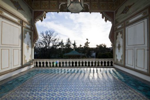Geniş bir eyvanla girildiğini belirttiğimiz zemin kat sofası çini kaplıdır, tam ortada restorasyon çalışması sırasında tekrar yapıya getirilen mermer havuz görülmektedir. Havuzun esas yapısı orijinal olup, eski fotoğraflarda görülen çevre alanı yeni yapılmıştır. Orta sofanın sağında iki ahşap kolon ile ana hacimden ayrılan merdiven evi yer almaktadır. Geniş bir ahşap merdiven üst kata ulaşımı sağlar. Bu hacmin hemen karşısında, benzer şekilde iki ahşap kolonla sofadan ayrılan bir eyvan bulunmaktadır. Tüm bu hacimlerin duvarları kalemişi panolarla süslüdür. Tavanlar ise ahşap çıtalarla bölümlere ayrılmış olup, değişik motiflerle bezenmiştir. Girişin her iki yanında yer alan dikdörtgen odaların duvar ve tavanları düz olup, diğer odalara göre çok sadedir. Benzeri saray yapılarındaki odaları gözönüne alarak bu odaların yaver veya hizmetli odaları olduklarını söylemek gerekir. Giriş sofasından iki kanatlı bir kapı ile geçilen arka sofa da dikdörtgen olup, her ki yanında birer küçük oda bulunmaktadır. Bu odaların da hizmetliler tarafından değişik amaçlarla kullanılmakta oldukları düşünülebilir. Arka veya iç sofa diyebileceğimiz orta hacim, üç adet çift kanatlı, camlı kapı ile küçük bir terasa açılmakta, buradan altı basamaklı, taş korkuluklu bir mermer merdivenle bahçeye ulaşılmaktadır.